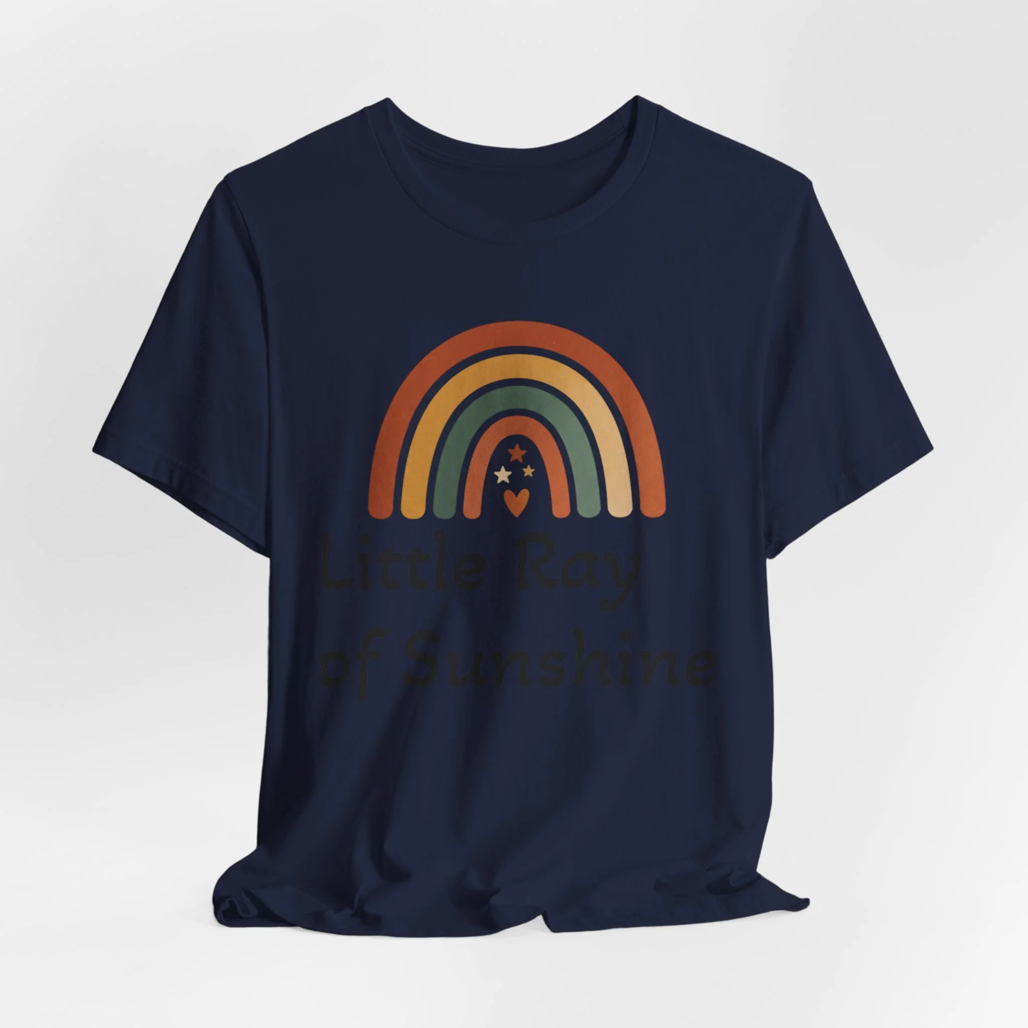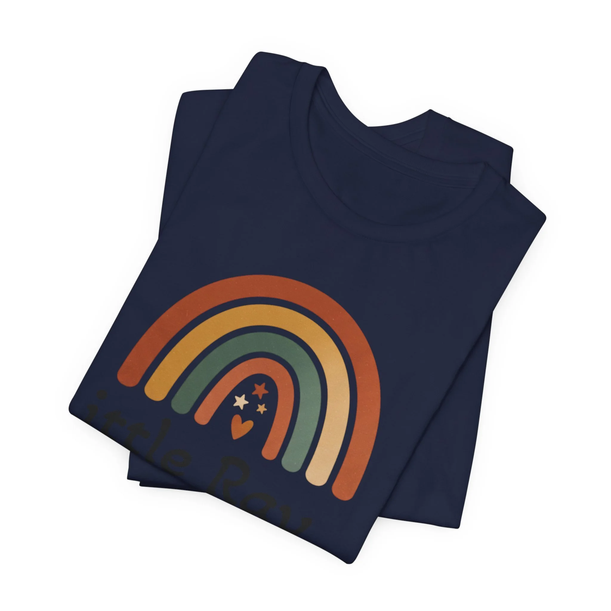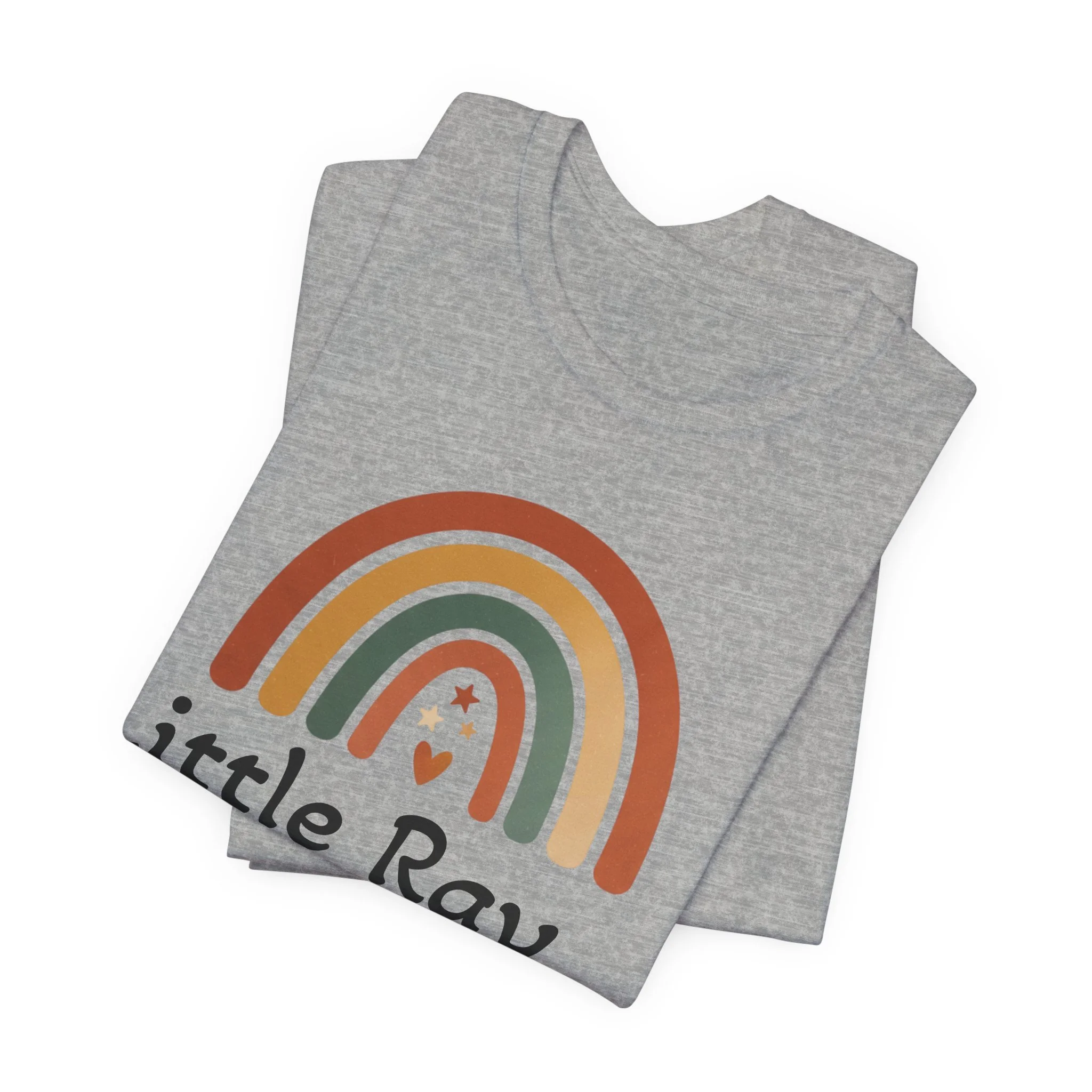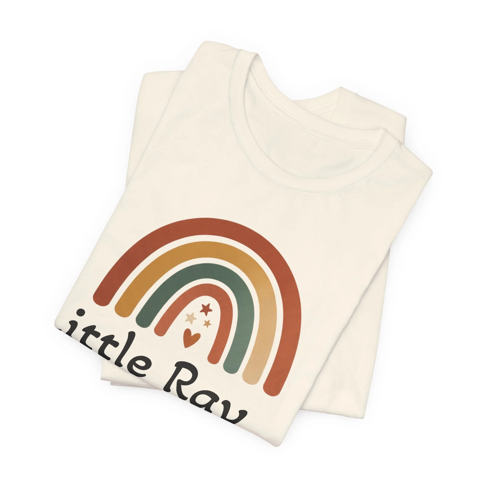 Soft, earthy rainbow arc printed on a lightweight unisex tee, tuned to the neutral-rainbow and boho-desert aesthetic. The minimal arc uses muted terracotta, sage, sand, and cream bands with a small friendly motif beneath, creating a calm, inclusive vibe that reads as nursery-friendly yet wearable for everyday layered looks. The restrained palette and simple composition match neutral rainbow and boho rainbow searches for shoppers seeking gentle, modern basics.