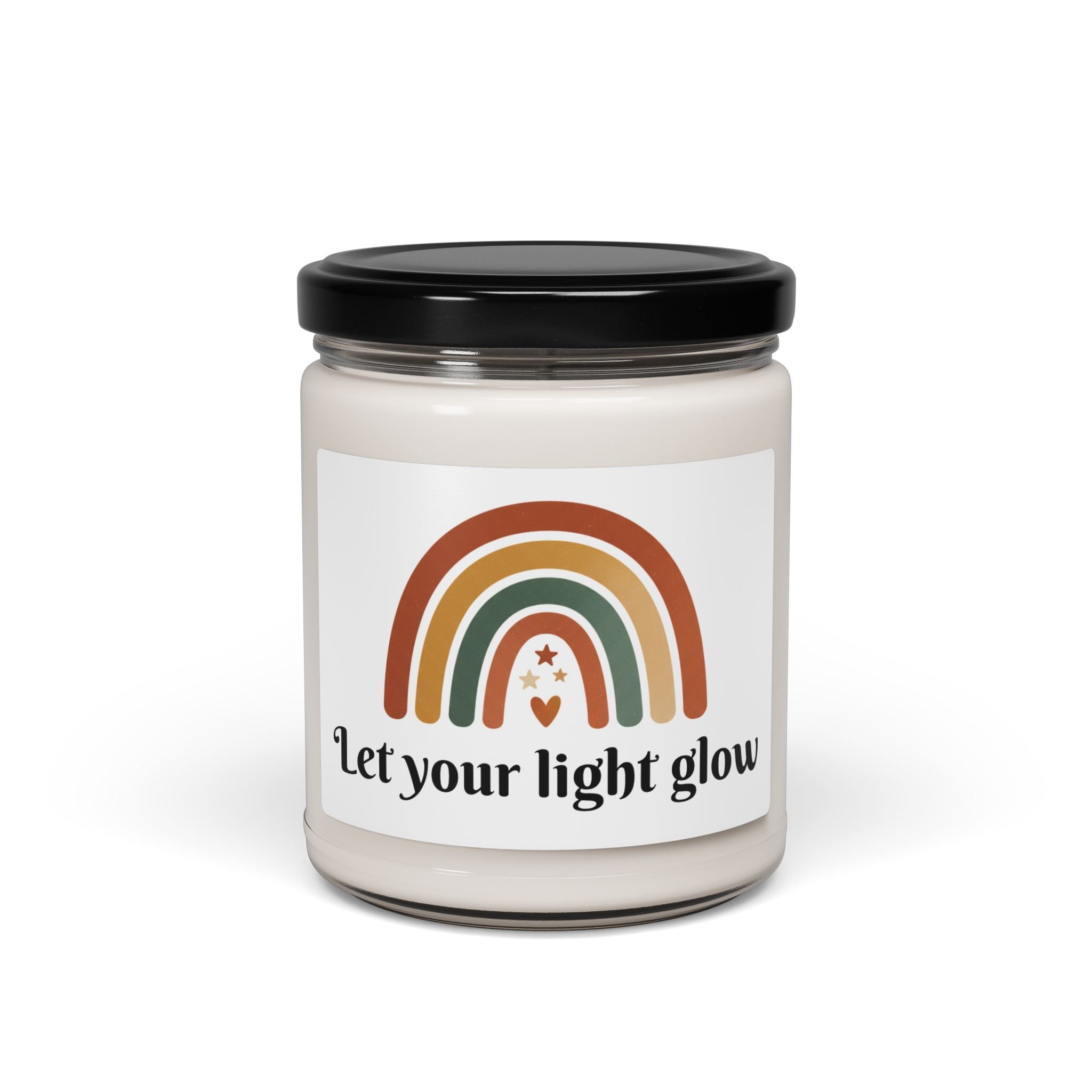 Neutral-rainbow soy candle with a muted boho arc motif that brings soft, grounded warmth to nurseries and calm living spaces. The simple terracotta-sage-cream rainbow print reads as gentle and inclusive; paired with natural soy wax and a cotton wick it creates a quiet, cozy atmosphere while the reusable glass jar doubles as low-key decor. Fragrance options range from bright orchard and oceanic musk to spice-forward and unscented choices, letting buyers match the scent to a relaxed, modern-boho room palette.